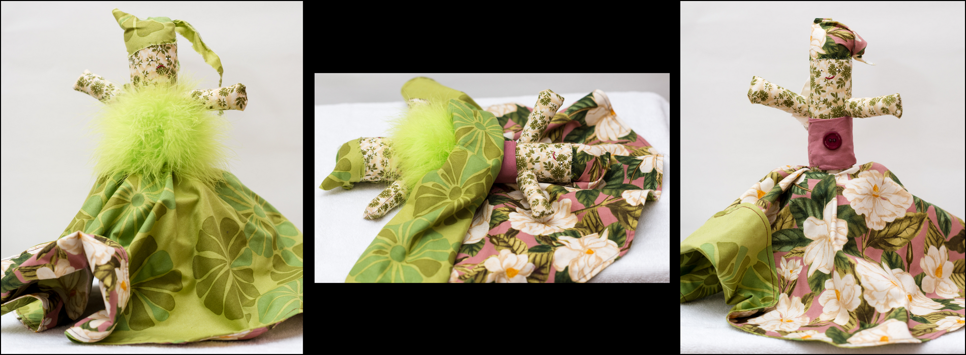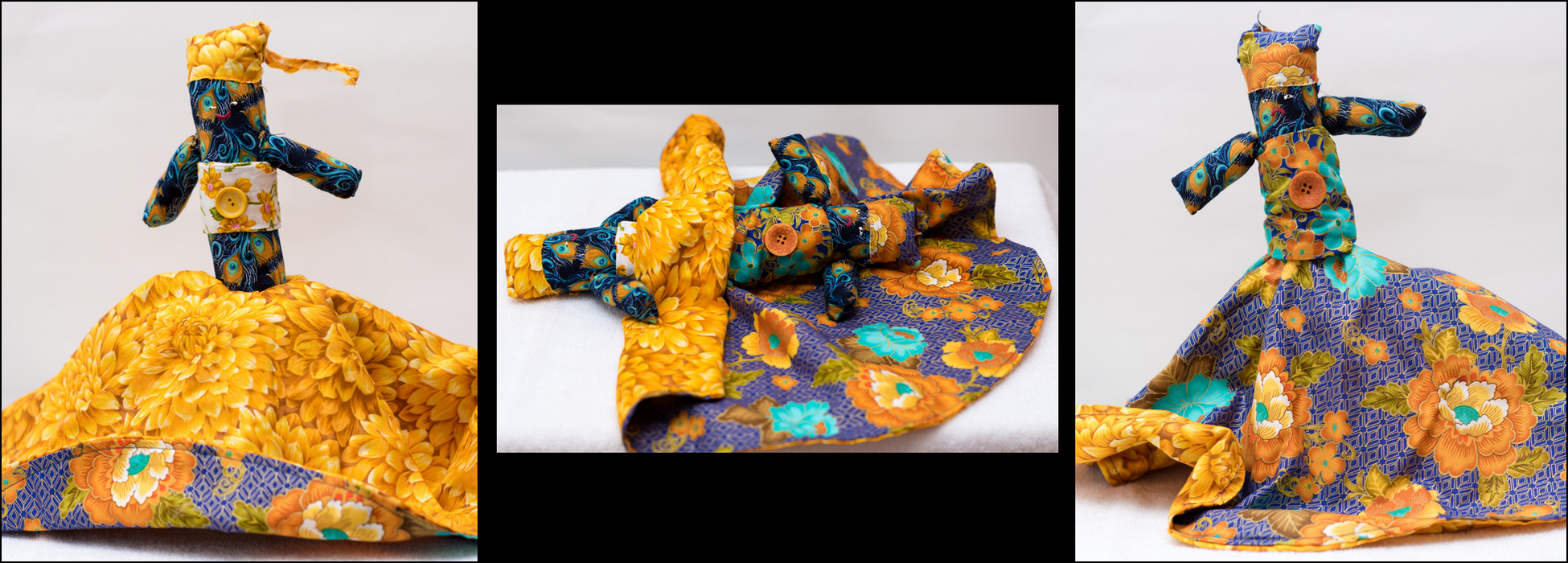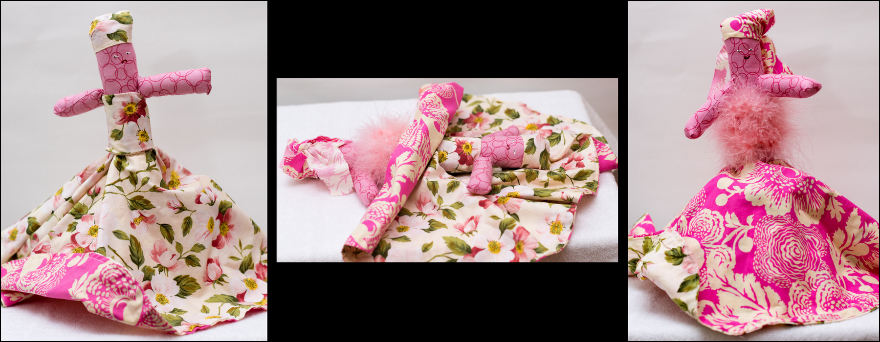 Each image set shows one side, the flip, then the second side of the Topsy Turvy Doll.