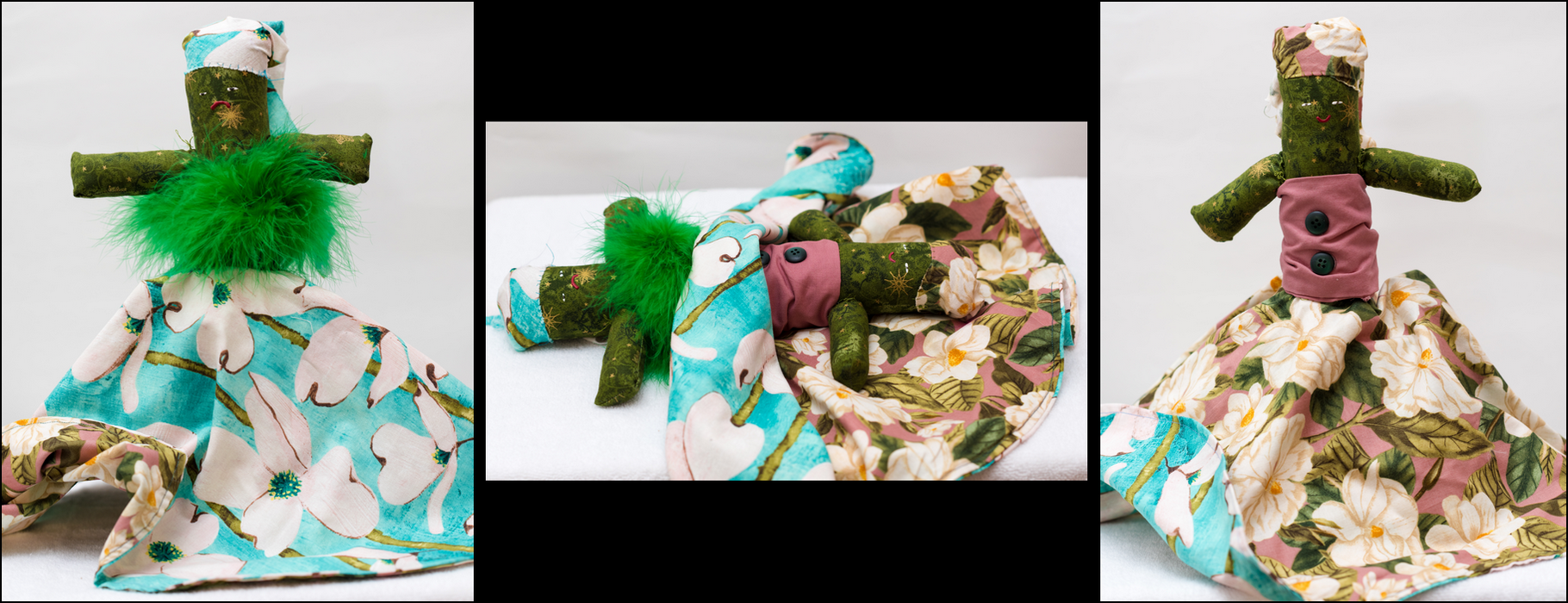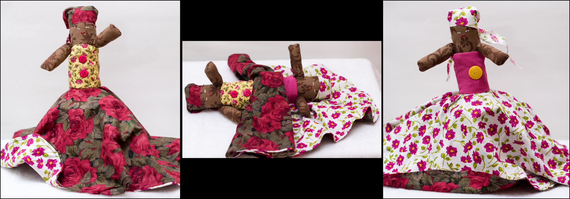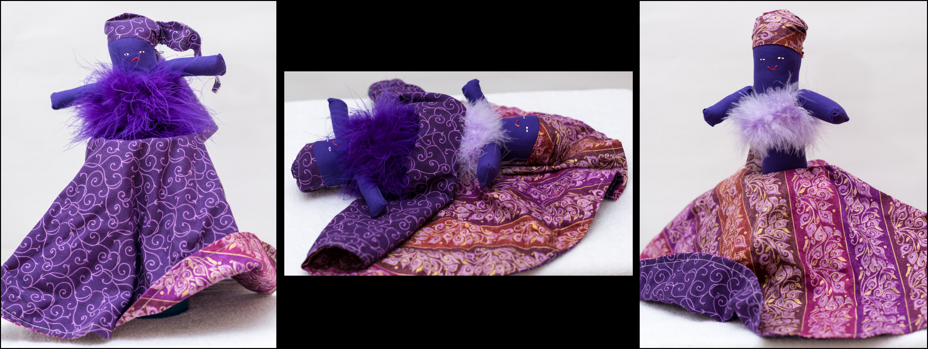 Each image set shows one side, the flip, then the second side of the Topsy Turvy Doll.